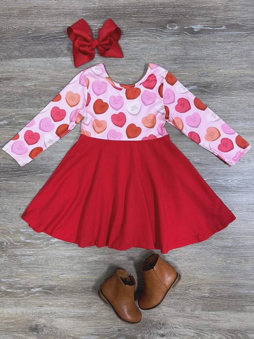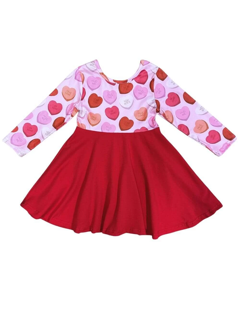 Make sure your little heart breaker is dressed to impress in our adorable Miss Heart Breaker Pink & Red Girls Valentine’s Day Skater Dress! This dress features a pink top with candy hearts and a matching red skirt. We are loving this dress with a pair of tights, white boots, and a matching pink or red hair bow. The dress is perfect playdates, Valentine’s Day dates, shopping days, and so much more! Pick up this dress for her and checkout our entire best selling dress collection!