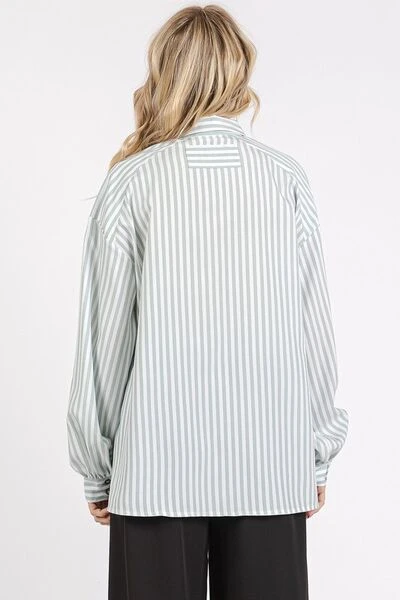 The Button Down Striped Long Sleeve Shirt is a classic and versatile wardrobe staple. Its timeless design featuring stripes and a summary-down front makes it easy to style for both casual and more polished looks. The long sleeves add a touch of sophistication while keeping you warm during cooler days. This shirt can be dressed up with tailored pants or skirts for a professional outfit, or paired with jeans for a more relaxed vibe. Elevate your everyday style effortlessly with the Button Down Striped Long Sleeve Shirt as a versatile and chic addition to your wardrobe.