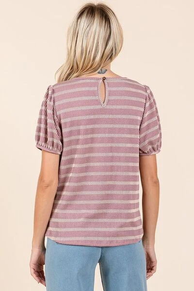 The Striped Short Puff Sleeve Knit Top is a charming and feminine piece that adds a touch of whimsy to any outfit. Featuring classic stripes, this top exudes a timeless and versatile appeal. The short puff sleeves add a playful and romantic flair, perfect for adding a stylish detail to your look. Crafted from knit fabric, this top offers a comfortable and flattering fit. Pair it with high-waisted jeans or a skirt for a chic and casual ensemble that is perfect for various occasions. Embrace a playful yet elegant style with the Striped Short Puff Sleeve Knit Top as a delightful addition to your wardrobe.
