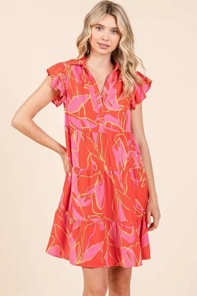 A leaf print ruffle sleeve tiered mini dress is a stylish and playful dress featuring a leaf print pattern. The ruffle sleeves add a touch of femininity and movement to the dress, while the tiered design creates a layered and textured look. The mini length falls above the knee, offering a fun and youthful vibe to the dress. The leaf print gives the dress a fresh and natural feel, perfect for spring and summer occasions. This type of dress is versatile and can be dressed up with heels for a night out or worn casually with sandals for a daytime look. It’s a charming and trendy choice for a fashionable outfit.