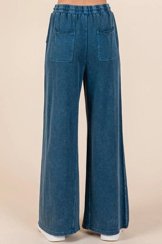The Mineral Wash French Terry Drawstring Wide Leg Pants are comfortable and stylish bottoms made from soft French terry fabric. They feature a drawstring waist for an adjustable fit and wide legs for a relaxed and trendy look. Perfect for a casual and laid-back style, these pants can be paired with a variety of tops for a versatile outfit.