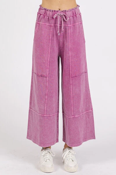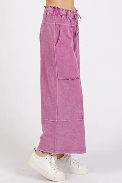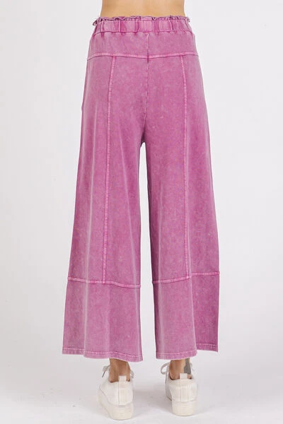 The Mineral Wash Seam French Terry Wide Leg Pants are a casual and comfortable option for everyday wear. The mineral wash treatment gives them a unique and vintage look. Featuring seam detailing, these pants have a subtle and stylish touch. Made from French terry fabric, they are soft and cozy. With a wide leg silhouette, they offer a relaxed and laid-back vibe perfect for lounging or running errands.