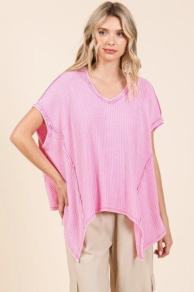 The Mineral Wash Waffle Knit Pointed Hem Oversized Top is a unique and stylish addition to your casual wardrobe. With a mineral wash finish, this top exudes a trendy and edgy vibe that is perfect for laid-back days. The waffle knit texture adds a cozy and tactile element to the design, providing both comfort and visual interest. The pointed hemline offers a modern twist to the oversized silhouette, creating a flattering and stylish look. Pair this top with leggings or jeans for a relaxed and effortlessly cool outfit that’s easy to style. Elevate your loungewear collection with the Mineral Wash Waffle Knit Pointed Hem Oversized Top as a trendy and comfortable staple.