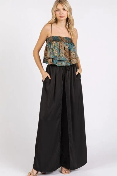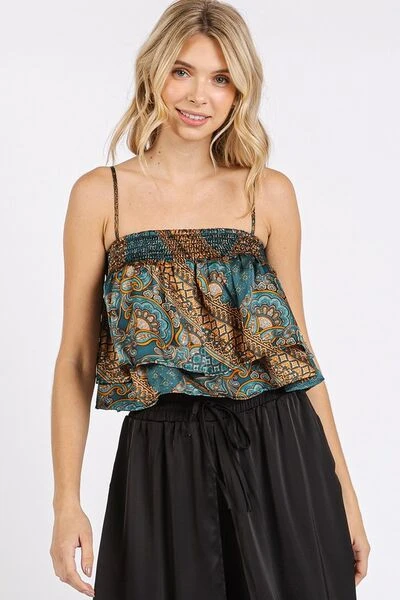 The Paisley Patchwork Print Satin Ruffle Crop Cami is a statement piece that exudes bohemian charm and femininity. Featuring a colorful paisley patchwork print, this cami top adds a vibrant and eclectic touch to any outfit. The satin fabric lends a luxurious and silky texture to the piece, creating a chic and elegant look. The ruffle detailing adds a playful and romantic flair, perfect for adding dimension to your ensemble. Pair this crop cami with high-waisted jeans or a skirt for a stylish and trendy outfit that’s perfect for both casual and dressy occasions. Embrace a free-spirited and fashion-forward style with the Paisley Patchwork Print Satin Ruffle Crop Cami as a standout addition to your wardrobe.