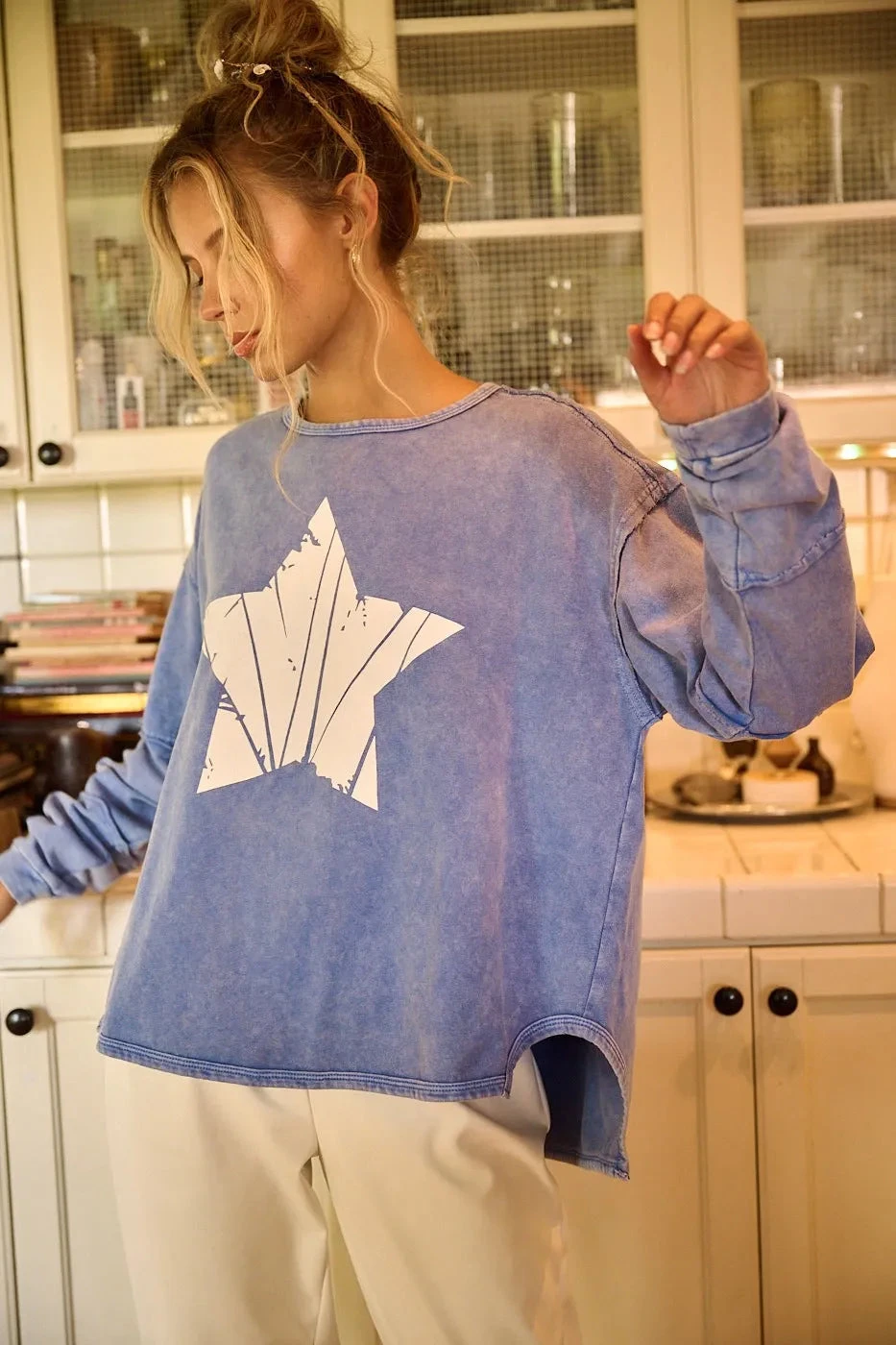 This long sleeve top features a star graphic design on a trendy mineral wash fabric for a cool and casual look. The relaxed fit and soft material make it perfect for everyday wear. Pair it with jeans or leggings for a laid-back and stylish outfit. Embrace a laid-back and effortlessly chic style with this star graphic top!