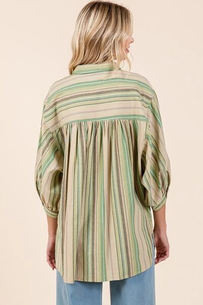 This summary-down shirt features chic stripes and trendy bubble sleeves for a modern and stylish look. The striped pattern adds a classic touch, while the bubble sleeves add a fun and unique twist to the design. Perfect for both work and casual outings, this shirt can be dressed up or down with ease. The summary-down front allows for versatile styling options, whether tucked in or worn loose. Elevate your wardrobe with this fashion-forward piece that combines sophistication with a touch of whimsy. Stay on-trend with this striped bubble sleeve summary-down shirt!