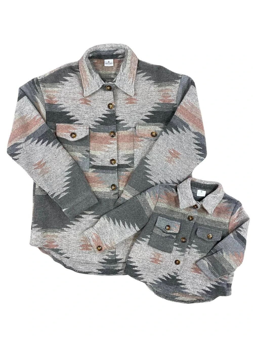 Elevate your casual chic with our Mom and Me Gray and Pink Aztec Print Shacket. This versatile piece showcases a trendy gray and pink Aztec pattern, marrying fashion with comfort. Its shacket style offers an ideal blend of shirt and jacket, perfect for transitioning seasons. Whether you’re exploring the outdoors or simply strolling around town, this shacket promises a fashionable and cozy experience for both you and your little one. And make more memories with any of our other Mom & Me looks.