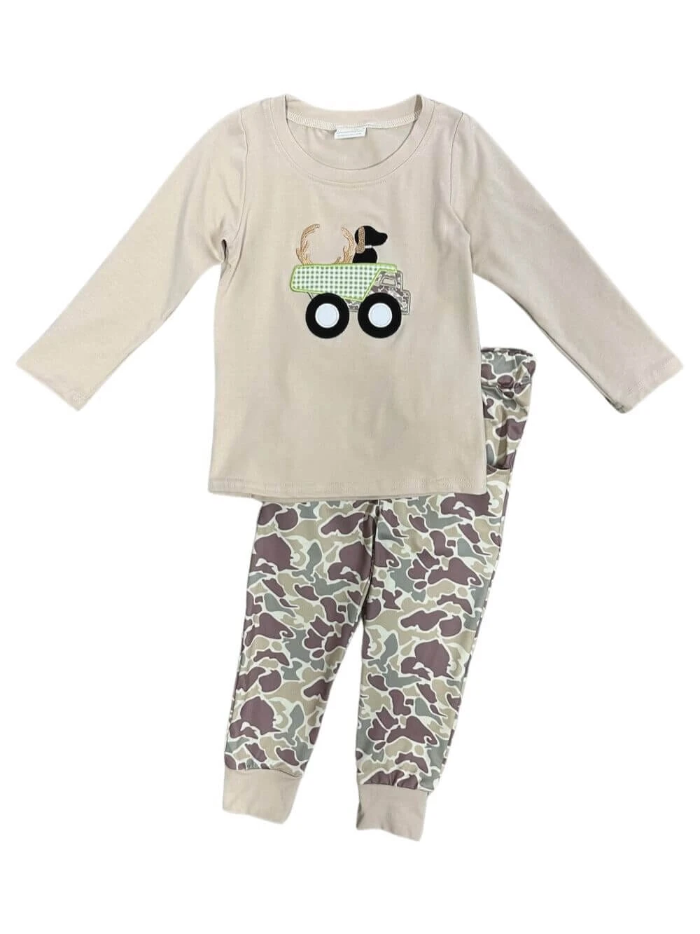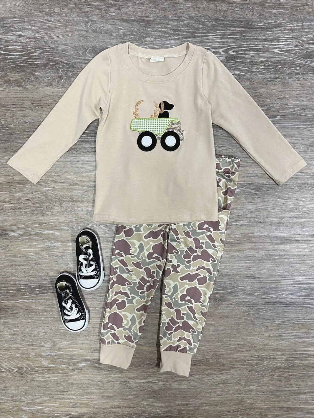 Gear up for adventure with our My Hunting Dog Boys Tan Camo Long Sleeve Outfit! The tan long sleeve top features a bold hunting dog graphic and deer antlers, paired perfectly with camo joggers for a rugged outdoor look. Comfortable and stylish, this two-piece set is ideal for little hunters who love exploring the great outdoors. And be sure to check out our other must have new arrivals.