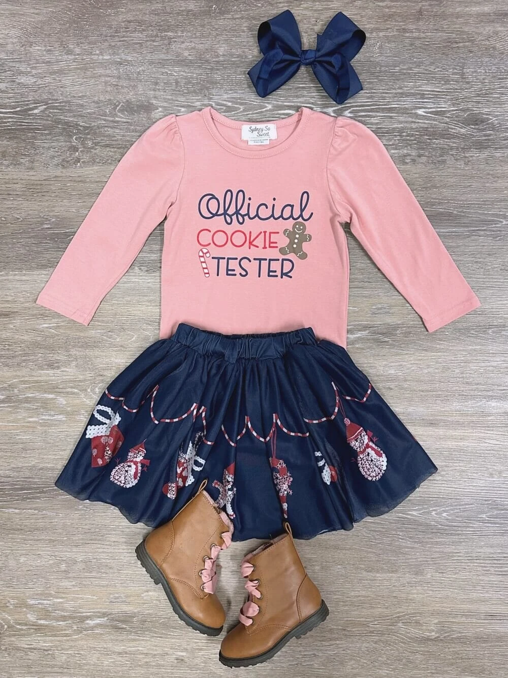 Our Official Cookie Tester Girls Christmas Skirt Outfit is a festive must-have! The adorable pink top proudly declares “Official Cookie Tester,” while the coordinating skirt is decorated with a playful cookie print. Perfect for holiday gatherings and baking fun, this outfit adds a sweet touch to the Christmas season with its cheerful and cute design! And be sure to check out our other must have new arrivals.