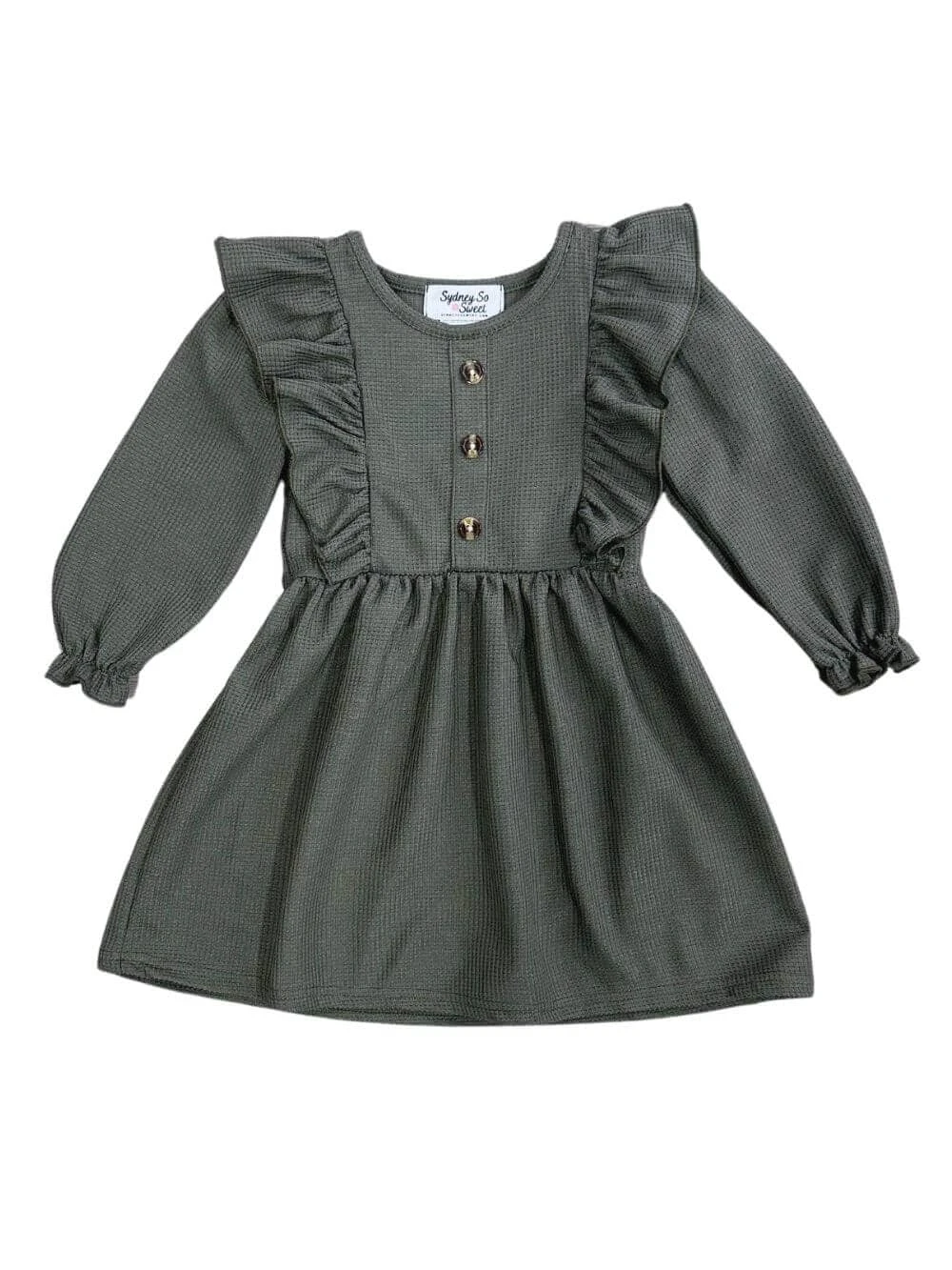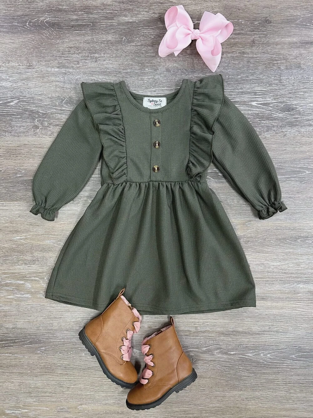 Add timeless elegance to her wardrobe with our Olive Green Girls Ruffle Trim Long Sleeve Dress. This chic dress features delicate ruffle trim and long sleeves, perfect for any occasion. Comfortable and stylish, it’s ideal for school, parties, or family gatherings. Enhance her style with this versatile and sophisticated dress. Shop now for this must-have wardrobe essential! And be sure to check out our other must have new arrivals.