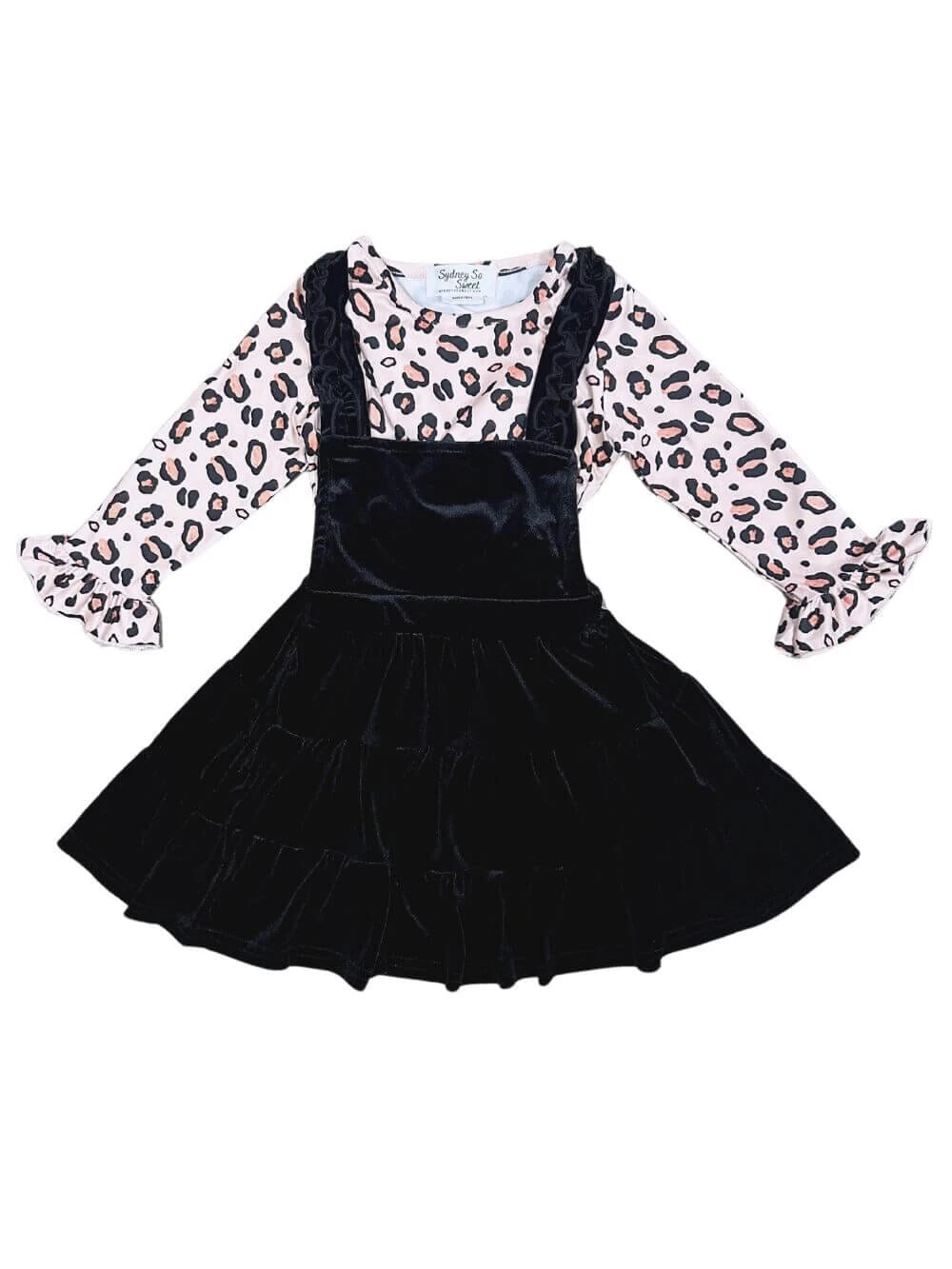 The Pale Pink Cheetah Black Velvet Ruffle Girls Jumper Dress Set is a chic and stylish outfit for any occasion. It features a black velvet jumper dress with elegant ruffle details, paired with a pale pink top adorned with a trendy cheetah print. Perfect for parties or everyday wear, this set adds a touch of sophistication to your little one’s wardrobe. And be sure to check out our other must have new arrivals.