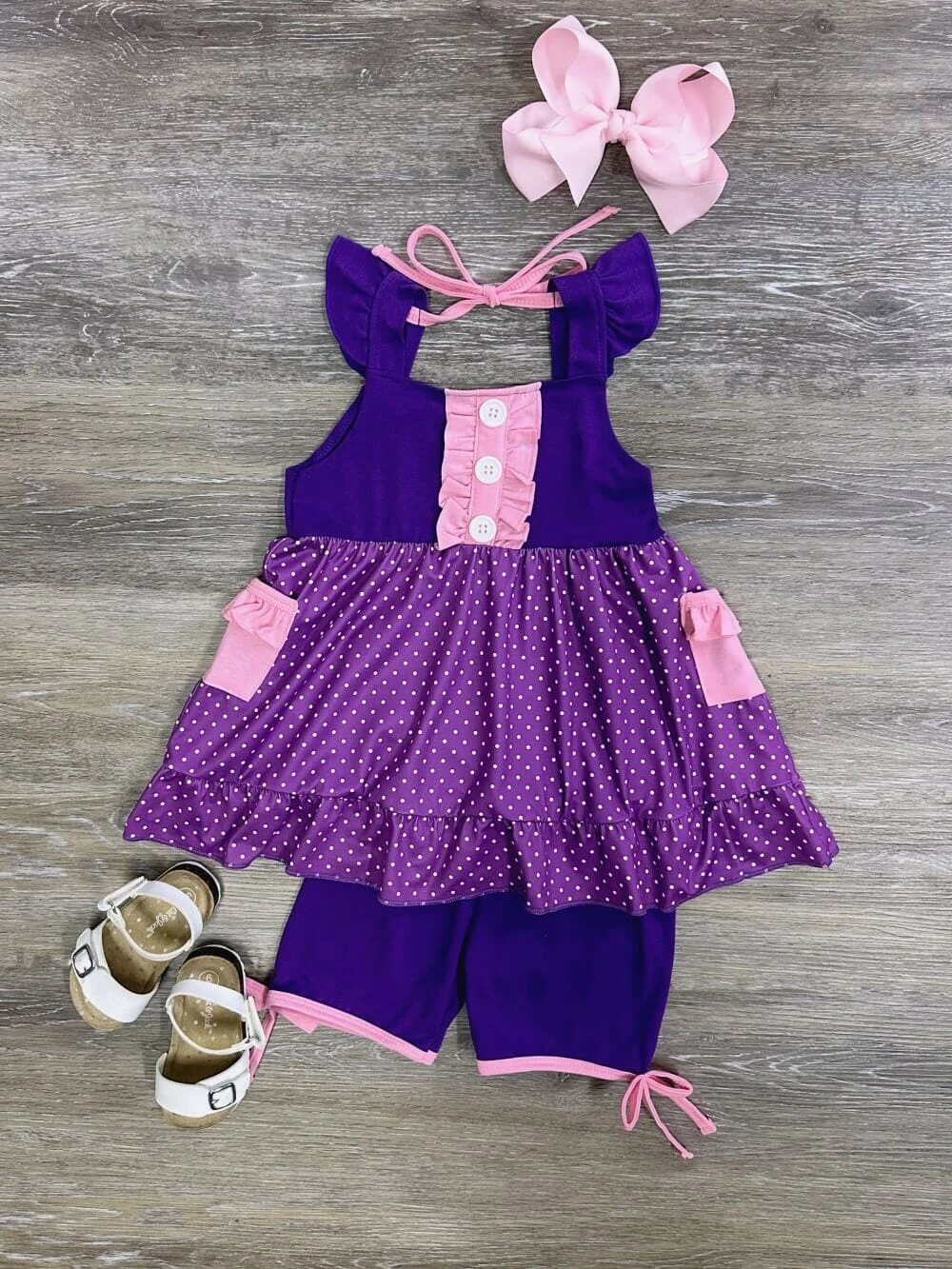 Delight your little one with our Pink & Purple Princess Flutter Sleeve Tunic Girls Shorts Outfit. This enchanting ensemble features a tunic with flutter sleeves and a charming princess design in pink and purple hues. Paired with coordinating shorts, it offers both comfort and style for playdates and adventures. Perfect for your young princess. Shop now for this adorable outfit! And be sure to check out our other must have new arrivals.