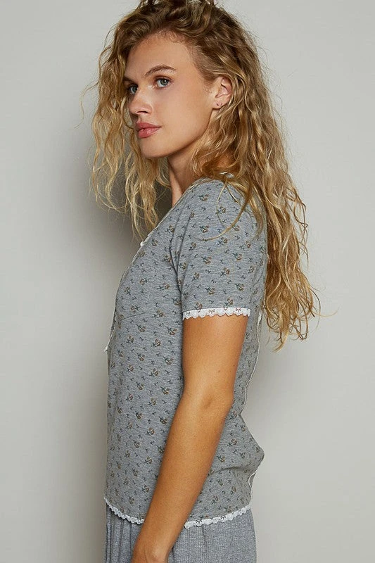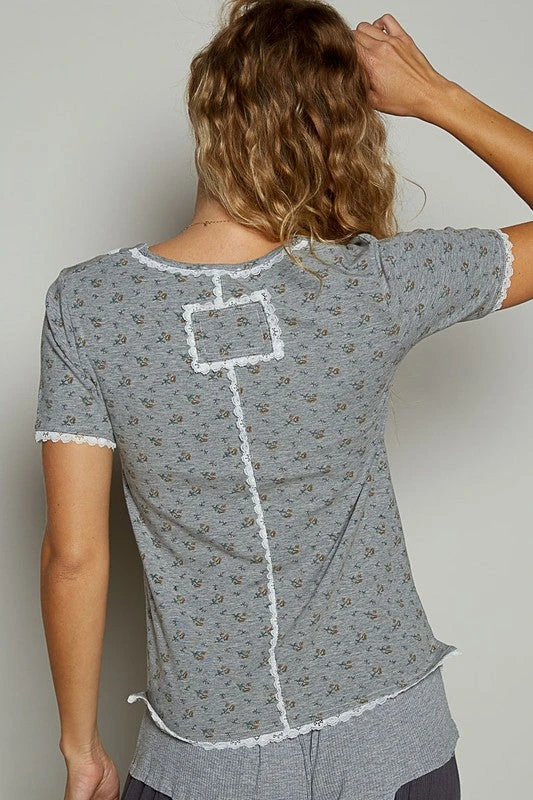 A Lace Detail Floral V-Neck Button Detail Short Sleeve T-Shirt is a charming and feminine top featuring lace accents, a floral pattern, a flattering V-neckline, and summary detailing. This t-shirt combines romantic elements like lace and floral prints with casual details like short sleeves and summarys, creating a versatile and stylish look. The lace detail adds a delicate touch, while the floral pattern adds a pop of color and interest. The V-neckline is flattering and the summary detailing adds a trendy twist to a classic t-shirt style. This top can be paired with jeans, shorts, or skirts for a chic and casual outfit suitable for various occasions.