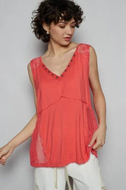 The Lace Detail Studded Crisscross Back V-Neck Sleeveless Top is a stylish and edgy piece that combines lace accents and trendy studs with a unique crisscross back design. The V-neckline adds a touch of sophistication and allure to the top. Sleeveless construction makes it perfect for warm weather or layering. This versatile top can be dressed up for a night out or paired with jeans for a more casual look, adding a trendy and fashionable vibe to your outfit.