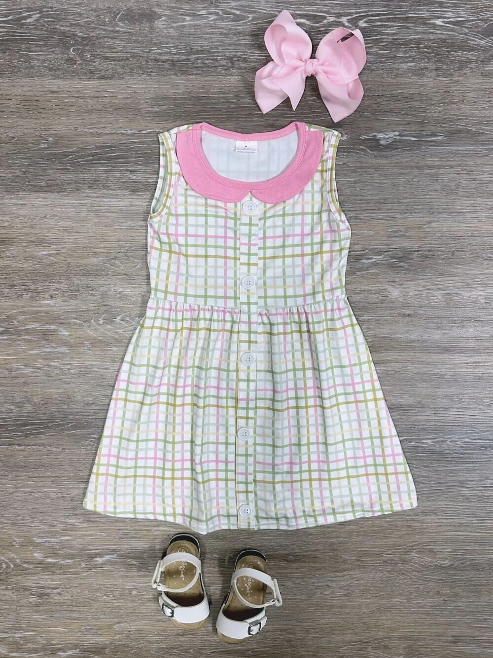 The Preppy Pastel Plaid Girls Sleeveless Spring Dress is a charming choice for warm-weather occasions. Featuring a delightful lime green, pink, and white plaid pattern, this dress is finished with a stylish pink collar for an extra pop of color. Perfect for Easter celebrations, spring outings, or special occasions, it’s both fashionable and comfortable for your little trendsetter. And be sure to check out our other must have new arrivals.