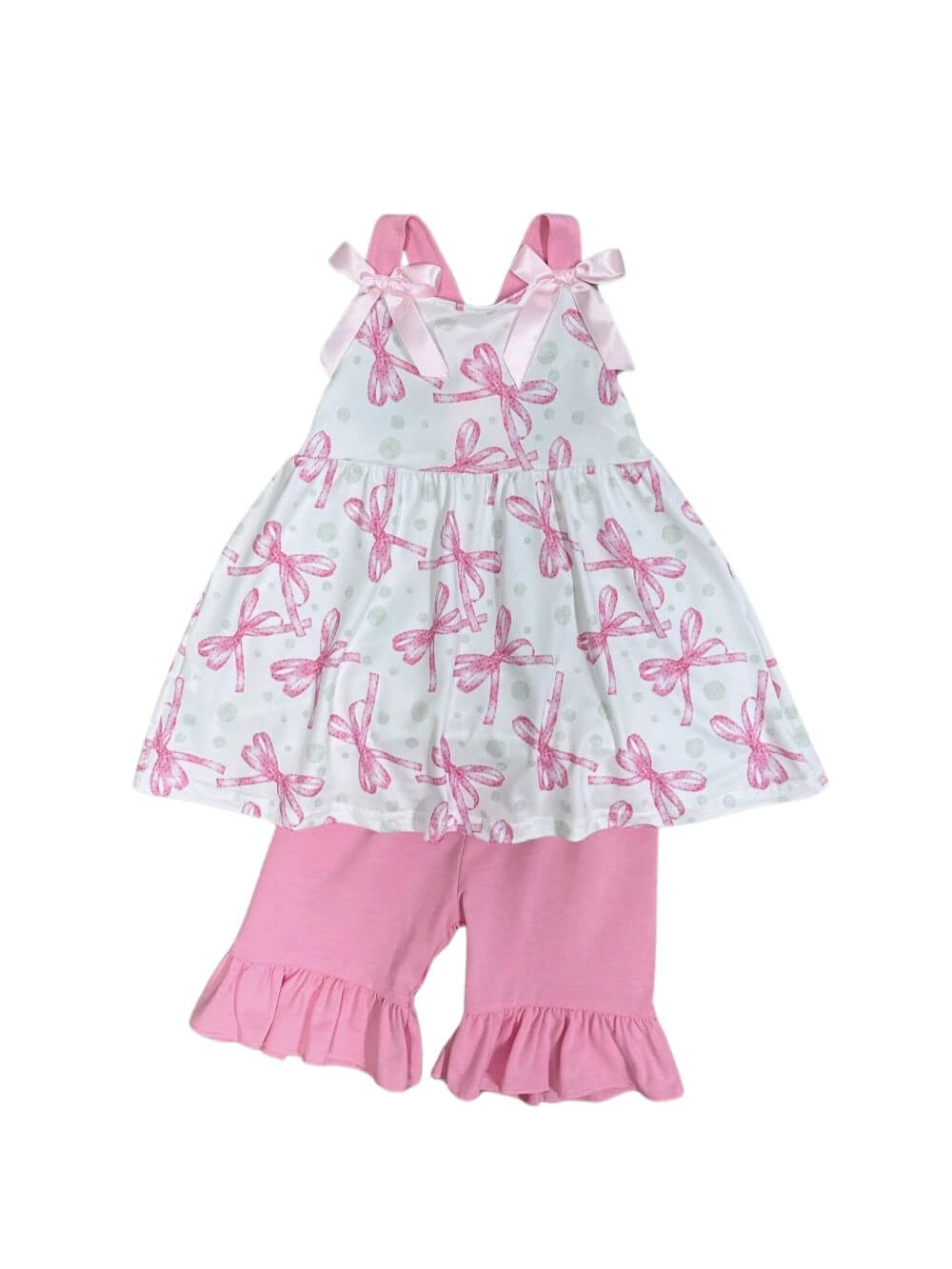 Our Pretty in Pink Bow Print Girls Shorts Outfit is a darling choice for warm-weather days. The tank top features an allover pink bow print, perfectly paired with matching pink ruffle trim shorts. This sweet and stylish set is ideal for birthdays, playdates, or everyday wear—full of charm, comfort, and girly coquette style she’ll love. And be sure to check out our other must have new arrivals.