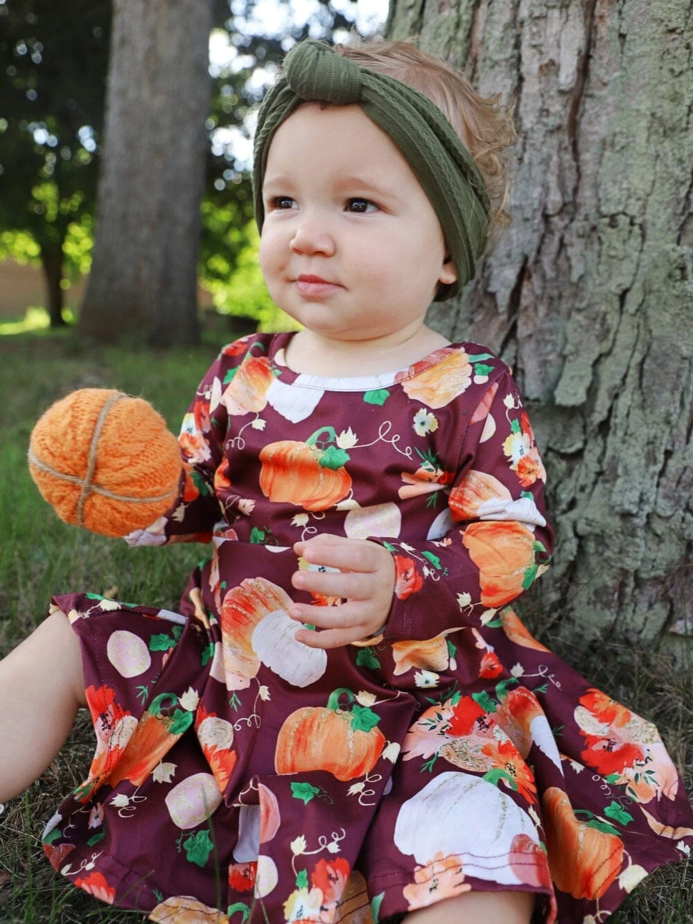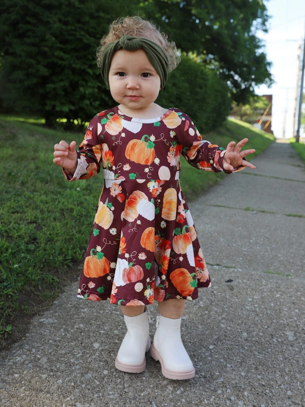 More pumpkins please! We are still obsessing over pumpkin print this fall, so don’t miss out on our Pumpkins Please Burgundy Long Sleeve Girls Fall Skater Dress! This long sleeve burgundy skater dress features lots of fall colored pumpkins all over. We are loving this dress with a pair of brown boots and a coordinating hair bow. This dress is perfect for a day at school, a fall photoshoot, trip to the pumpkin patch, and so much more! Pick up this fall dress while your little’s size is still in stock and be sure to checkout our other new fall arrivals.