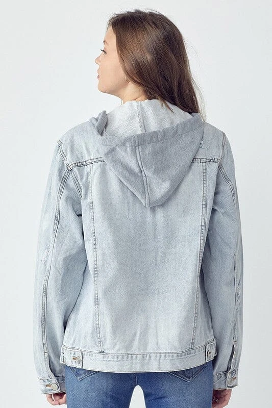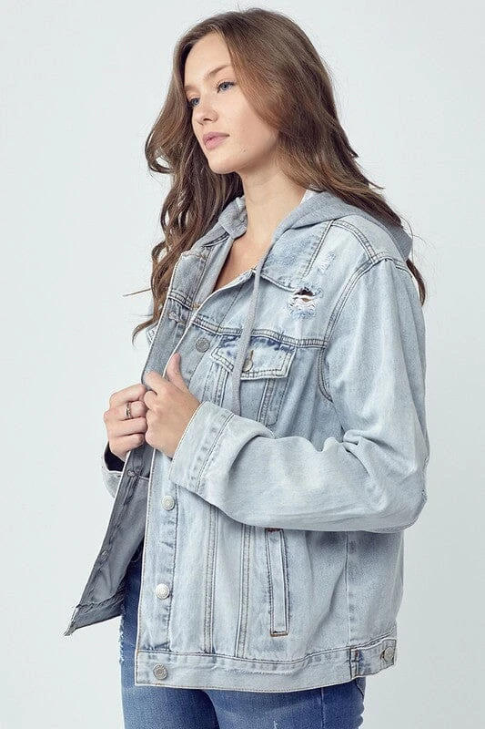The distressed drawstring hooded denim jacket features a rugged, worn-in look with distressing details such as fraying or fading. The drawstring hood adds a casual and functional element, allowing you to adjust the fit and stay cozy. This style of jacket pairs well with casual outfits, showcasing a fashionable and personalized touch.
