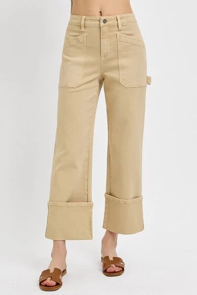 High Rise Wide Straight Cuffed Patch Jeans are a style of jeans that feature a high rise waistline, a wide leg that falls straight from the hip to the hem, cuffed bottoms, and decorative patches. The high rise design sits above the natural waistline, offering coverage and shaping to the midsection. The wide straight leg provides a relaxed and comfortable fit, while the cuffed bottoms add a touch of style and flair. The patch details can be decorative elements or added for a trendy, distressed look. These jeans combine elements of comfort, style, and fashion-forward design for a versatile and chic wardrobe staple.