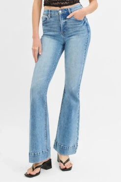 These premium flare jeans feature a high-rise elastic waistband designed for superior tummy control and all-day comfort. Made from quality stretch denim in a versatile light blue wash, these plus size jeans offer both style and functionality. The flattering flare silhouette elongates the legs while the elastic band provides a secure, comfortable fit. Perfect for casual everyday wear, these jeans include classic 5-pocket styling and durable construction that maintains shape throughout wear. The stretchy denim material allows for easy movement while the tummy control feature provides a smooth, flattering silhouette.