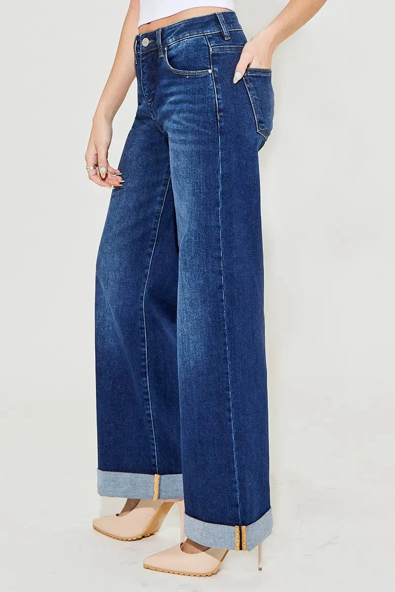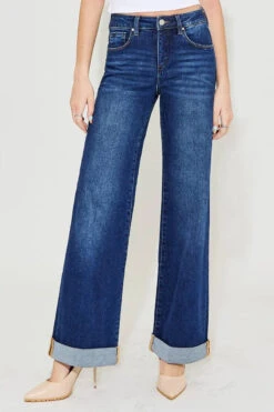 These premium wide-leg jeans combine classic styling with modern comfort. Crafted from high-quality stretch denim in a rich dark blue wash, featuring a flattering high-rise waist and sophisticated wide-leg cut. The versatile roll-up cuffs add styling flexibility, while the traditional 5-pocket design maintains classic jean aesthetics. Perfect for both casual and semi-formal occasions, these jeans offer excellent durability and shape retention throughout wear. The stretch composition ensures all-day comfort while maintaining a polished silhouette.