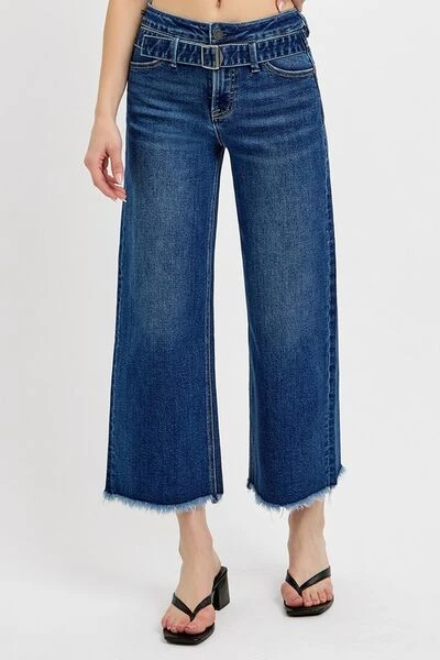 Raw Hem Wide Leg Attached Buckle Jeans are a unique and stylish pair of jeans that feature a wide-leg silhouette with a raw, unfinished hem and attached buckle details. The wide-leg style offers a relaxed and comfortable fit with a trendy and fashion-forward look. The raw hem adds a touch of edginess and a casual vibe to the jeans. The attached buckle details can be used for decoration or as functional elements to adjust the fit or add a unique design element to the jeans. Overall, these jeans are a statement piece that combines comfort, style, and creativity for a fashionable and individualistic look.