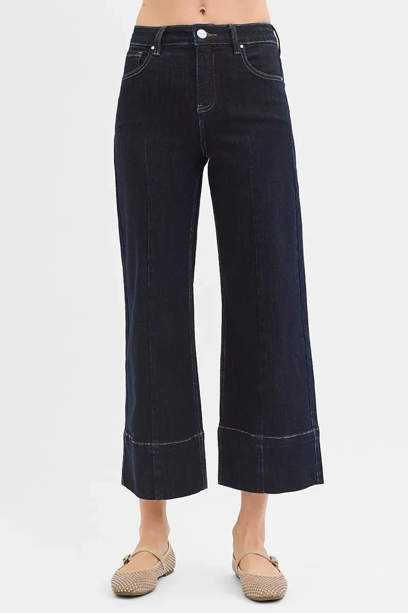 These sophisticated wide-leg cropped jeans combine modern style with classic denim appeal. Crafted from premium stretch denim in a versatile dark wash, featuring a flattering high-rise waist and wide-leg silhouette that creates an elegant, lengthening effect. The cropped length with wide cuff detail adds contemporary flair, while traditional contrast stitching and 5-pocket construction maintain classic jean elements. Perfect for both casual and semi-formal occasions, these jeans offer excellent comfort and style versatility.