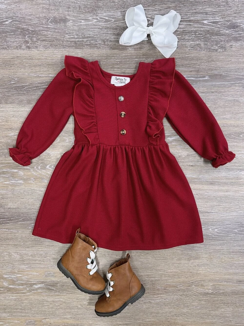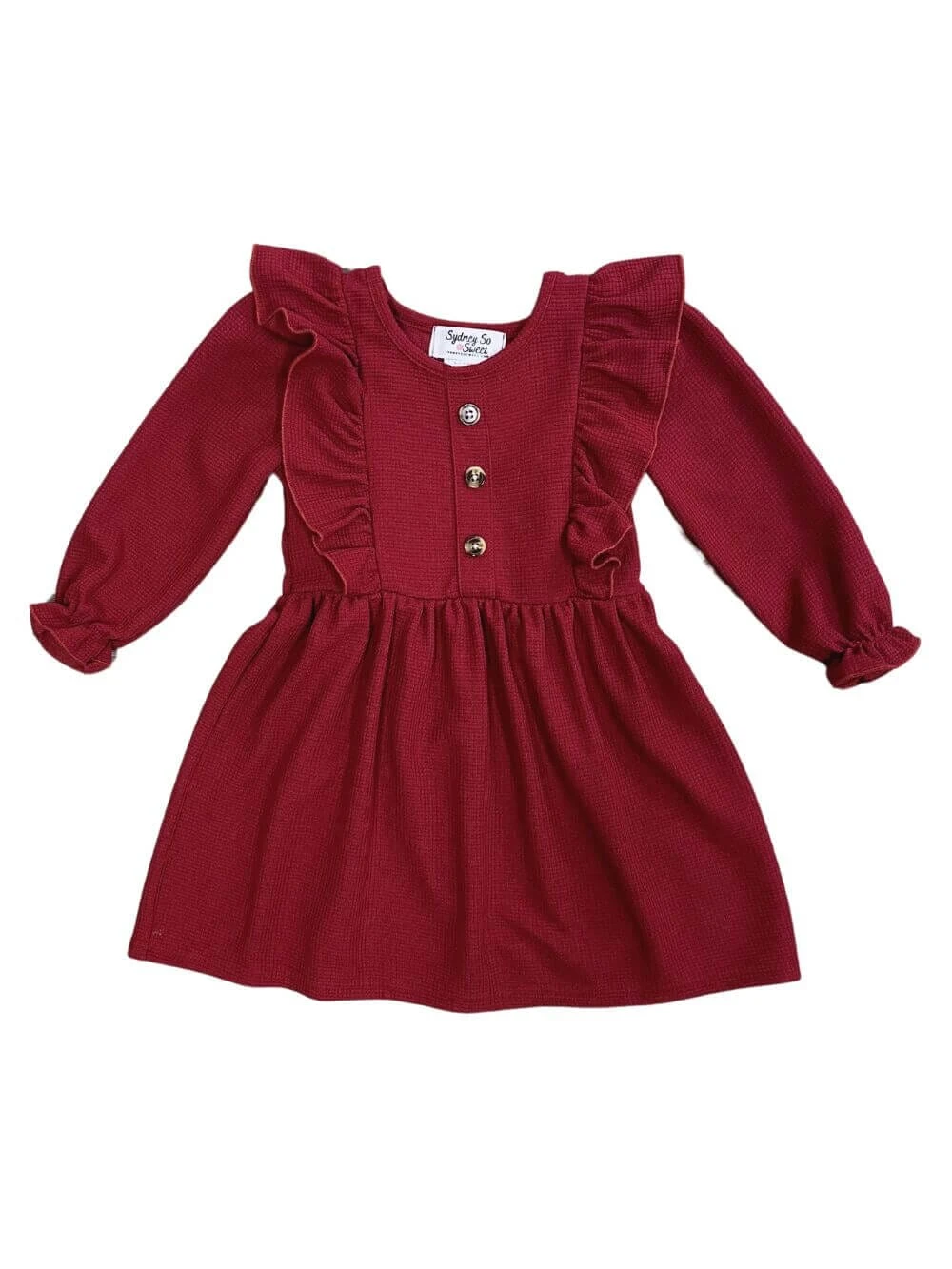 Enhance her wardrobe with our Rusty Red Waffle Knit Girls Ruffle Trim Long Sleeve Dress. Featuring elegant ruffle trim and long sleeves, this dress is perfect for any occasion. Comfortable and stylish, it’s ideal for school, parties, or family gatherings. Add a pop of color and sophistication to her look with this versatile dress. Shop now for this must-have fashion essential! And be sure to check out our other must have new arrivals.