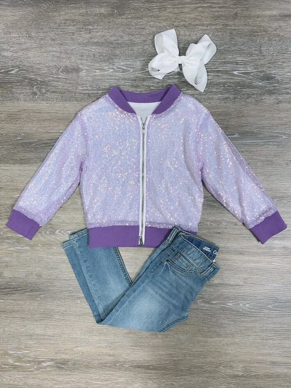 Add a touch of sparkle with our Sequin and Purple Girls Zip Up Bomber Jacket! This trendy jacket features shimmering sequins all over and vibrant purple trim. The zip-up style and ribbed cuffs make it perfect for layering. Great for adding fun flair to any outfit, it’s a must-have for stylish girls! And be sure to check out our other must have new arrivals.