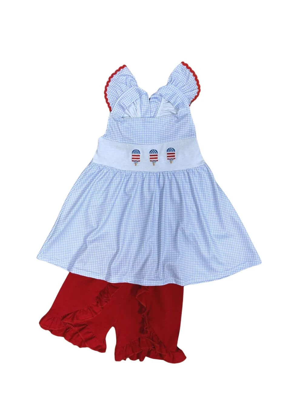 Stay cool in our Summer Chillin’ Girls Patriotic Popsicle Shorts Outfit. This sweet set features a blue and white tank tunic with festive red, white, and blue popsicles, paired with red ruffle trim shorts for a fun and breezy look. Perfect for summer, Fourth of July, and warm-weather adventures! And be sure to check out our other must have new arrivals.