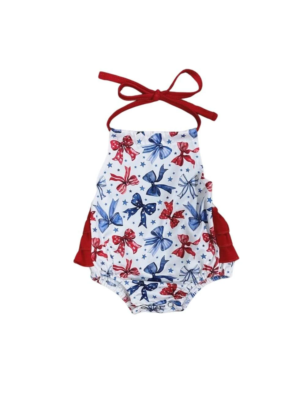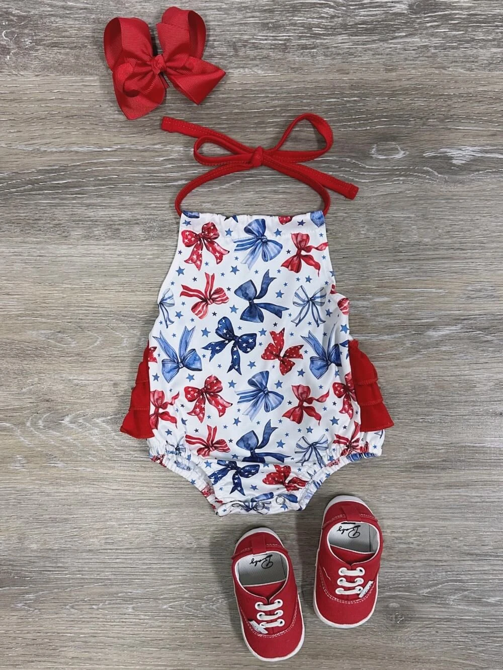 Our Sweet Land of Bows Girls Halter Baby Ruffle Romper is perfect for summer celebrations. This white halter-style bubble romper features red and blue bows all over and adorable red ruffles across the back. A festive and stylish outfit for Fourth of July, family gatherings, and sunny days—your little one will look cute and patriotic all season long. And be sure to check out our other must have new arrivals.