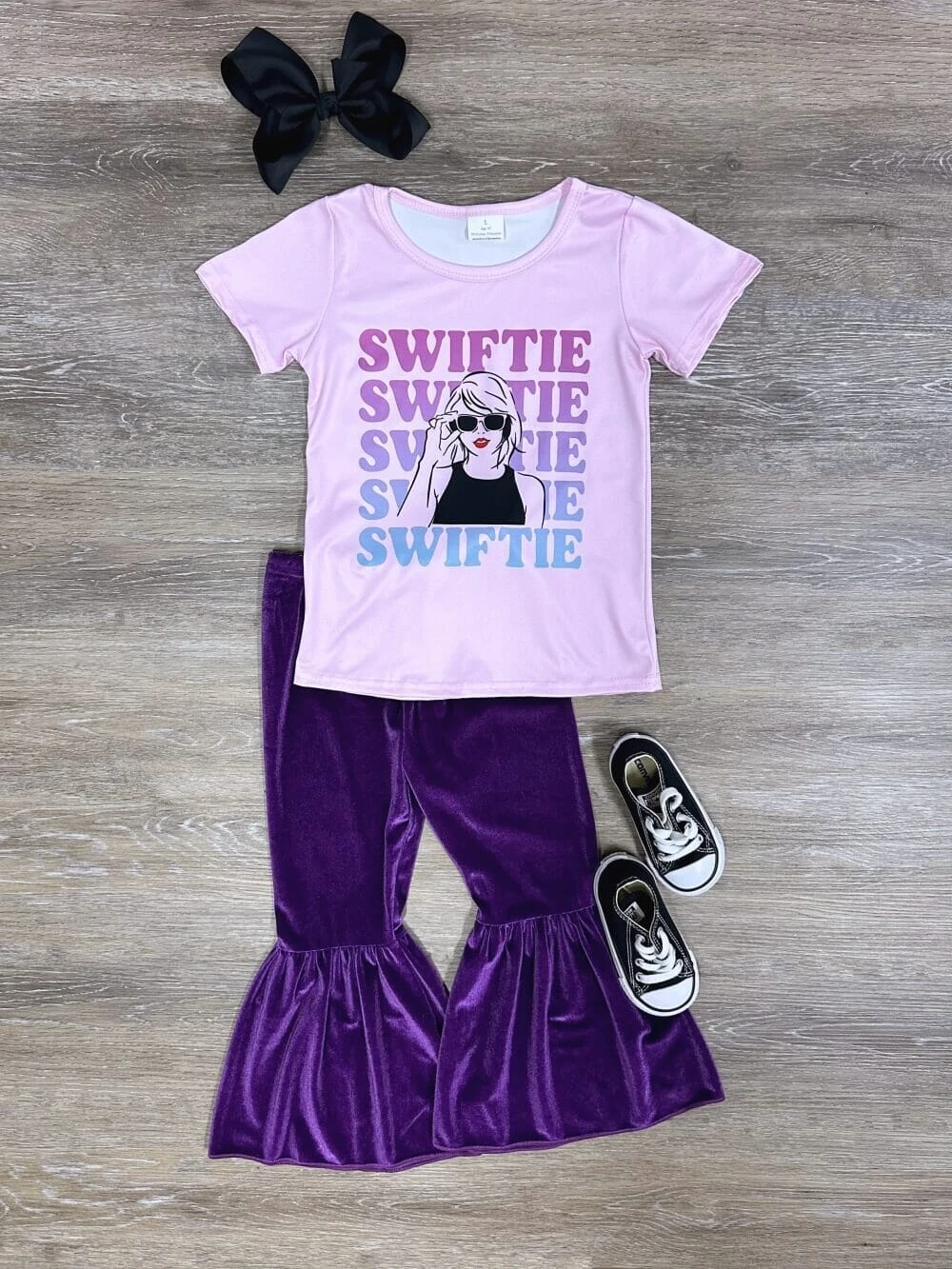 Celebrate her Swiftie spirit with our Swiftie Fan Purple Velvet Bell Bottoms Girls Outfit. This stylish ensemble features a short sleeve pink Swiftie top paired with luxurious purple velvet bell bottom pants. Perfect for concerts, parties, or casual outings, it combines comfort with trendy flair. Let her shine and show off her fandom. Shop now for this must-have Swiftie outfit! Shop now for this show-stopping outfit! And be sure to check out our other must have new arrivals.