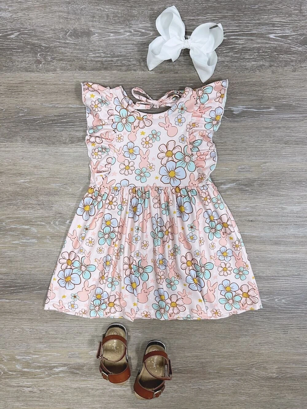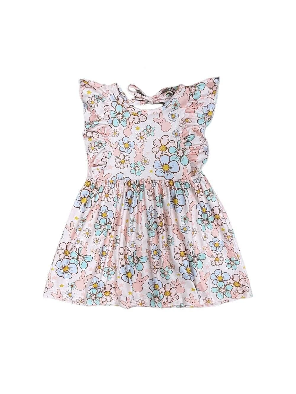 This Too Groovy Rabbit Floral Flutter Sleeve Girls Dress is perfect for Easter celebrations! With a playful retro floral bunny print, pastel hues, and flutter sleeves, it’s a dress made for hopping down the bunny trail in style. And, with its stretchy, cotton blend construction, you can be sure your little one will be as comfy as can be during their Easter egg hunt! Pair with some sandal from our Fabulous Footwear Collection for an unforgettable outfit.