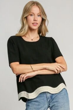 This top is made from a linen blend fabric, offering a lightweight and breathable feel perfect for the summer months. The scalloped hem detailing adds a touch of elegance and visual interest to the design. The blend of linen provides a comfortable and airy fit, making it ideal for warm weather. This top is versatile and can be dressed up or down, adding a chic and sophisticated touch to your outfit.