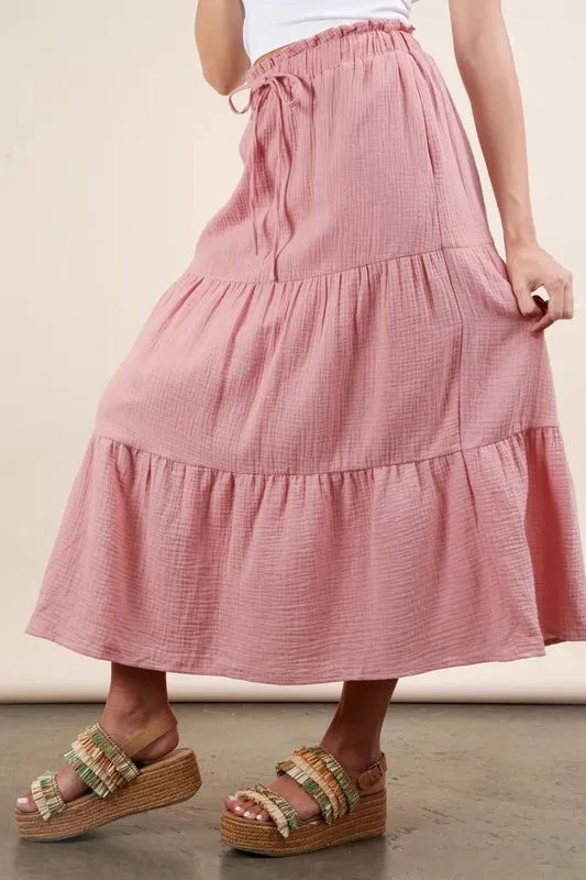 An elastic waist tiered maxi skirt typically features multiple layers of fabric that gradually increase in length towards the bottom, creating a flowy and bohemian look. The elastic waistband provides comfort and flexibility in sizing, making it easy to slip on and off. This versatile skirt can be dressed up or down and is a must-have fashion piece for any wardrobe.