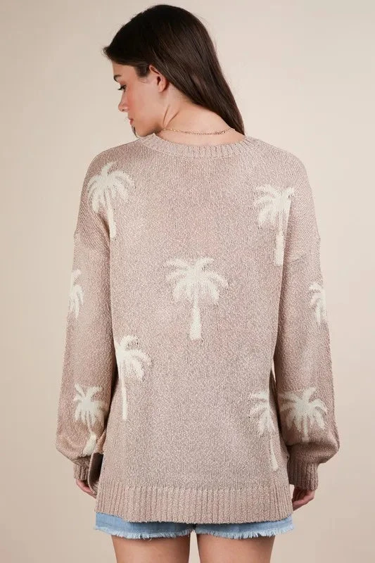 A palm tree graphic oversized knit sweater is a cozy and stylish sweater featuring a palm tree design. The oversized fit adds a relaxed and comfortable vibe to the sweater. Perfect for adding a touch of tropical flair to your winter wardrobe, this sweater can be paired with jeans or leggings for a casual and trendy look.