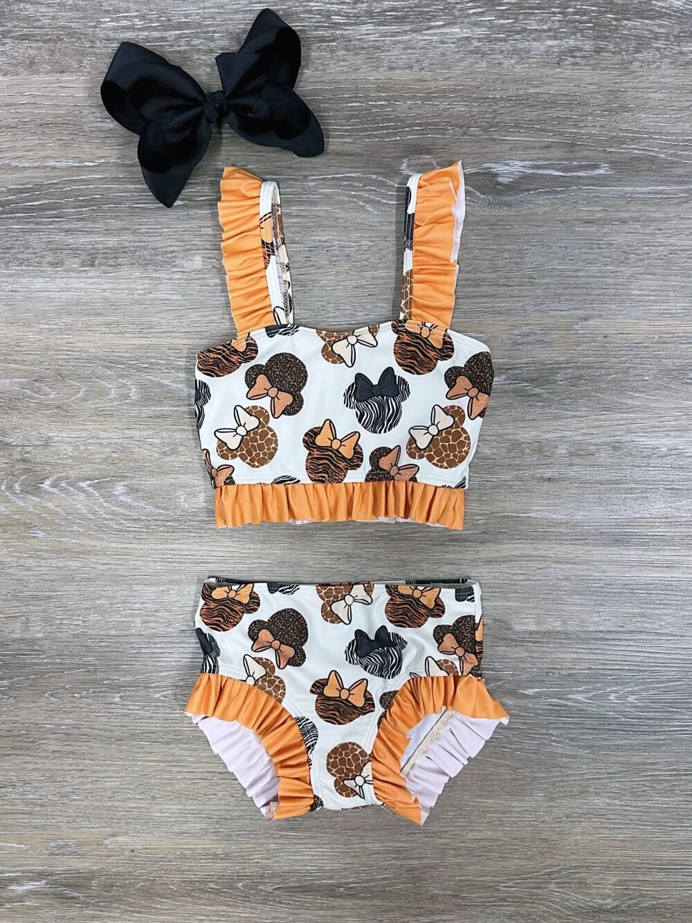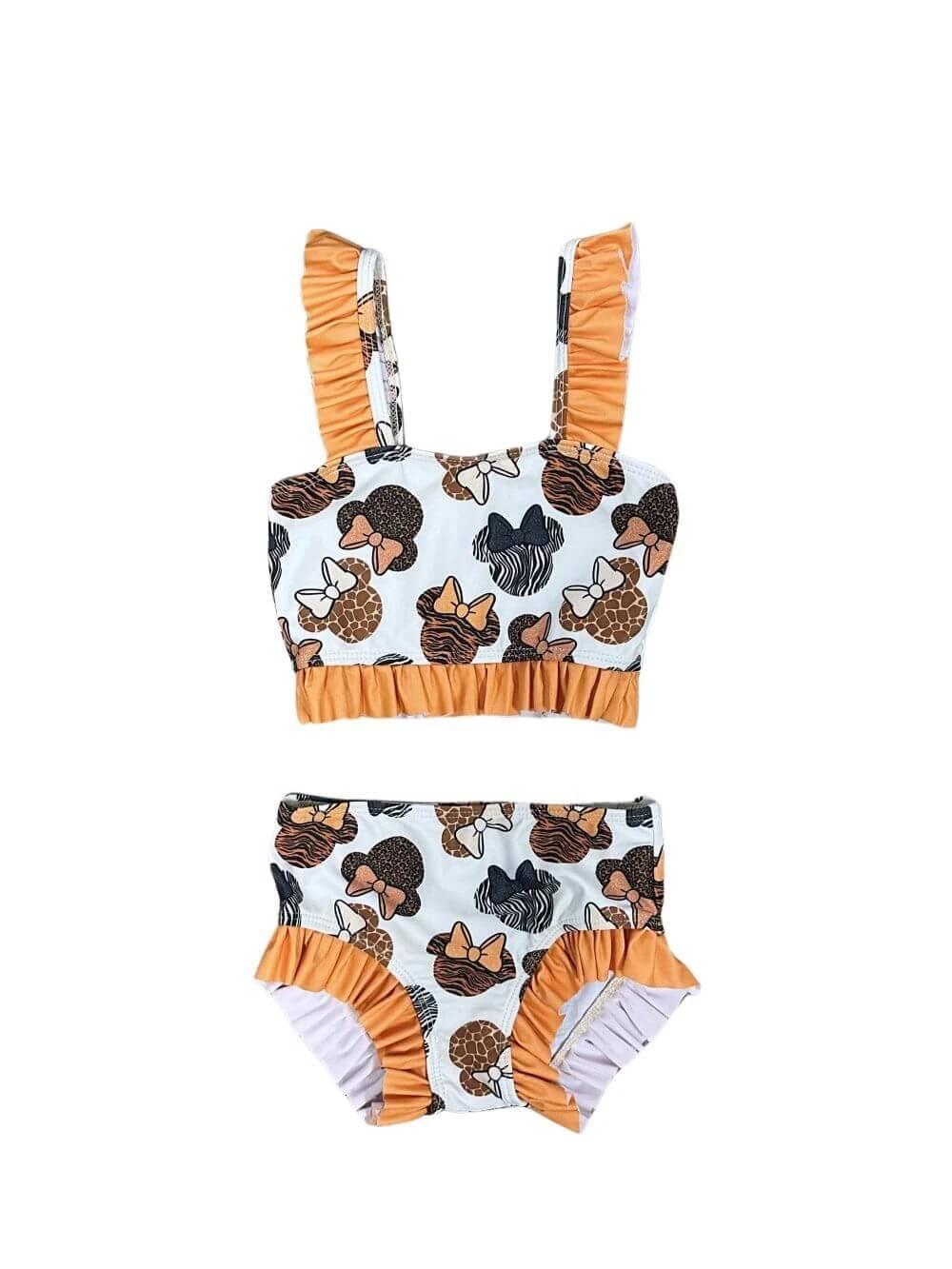 Make a splash with our Wild One Mouse Girls Ruffle Tankini Swimsuit. Featuring playful gold ruffle trim and adorable animal print mouse heads scattered across the fabric, this swimsuit is both cute and stylish. Your little one will love showing off their wild side while enjoying fun-filled days at the beach or pool. And be sure to check out our other must have new arrivals.
