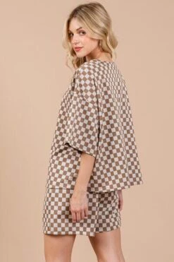 Annie Wear Checkered Round Neck Top And Drawstring Shorts Set